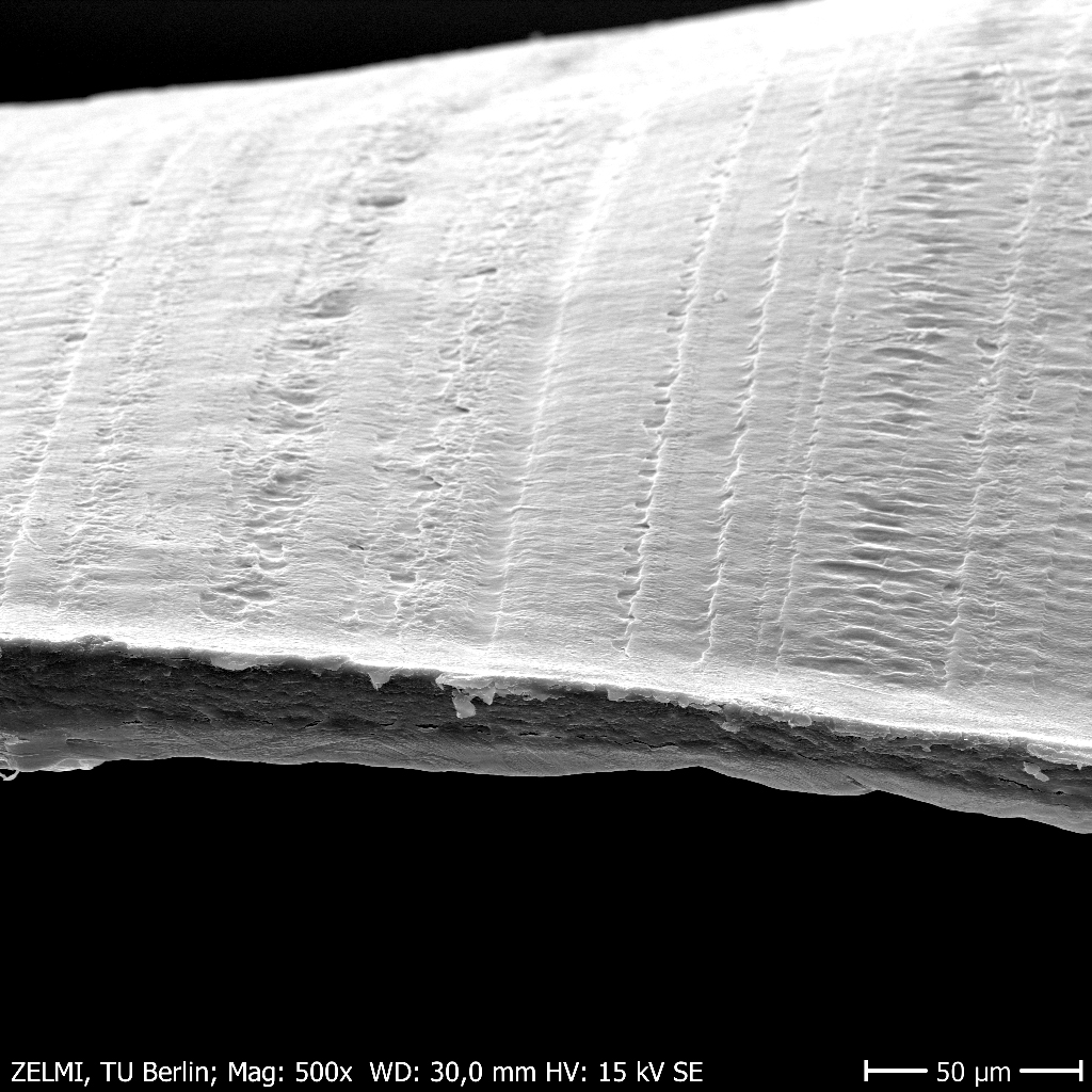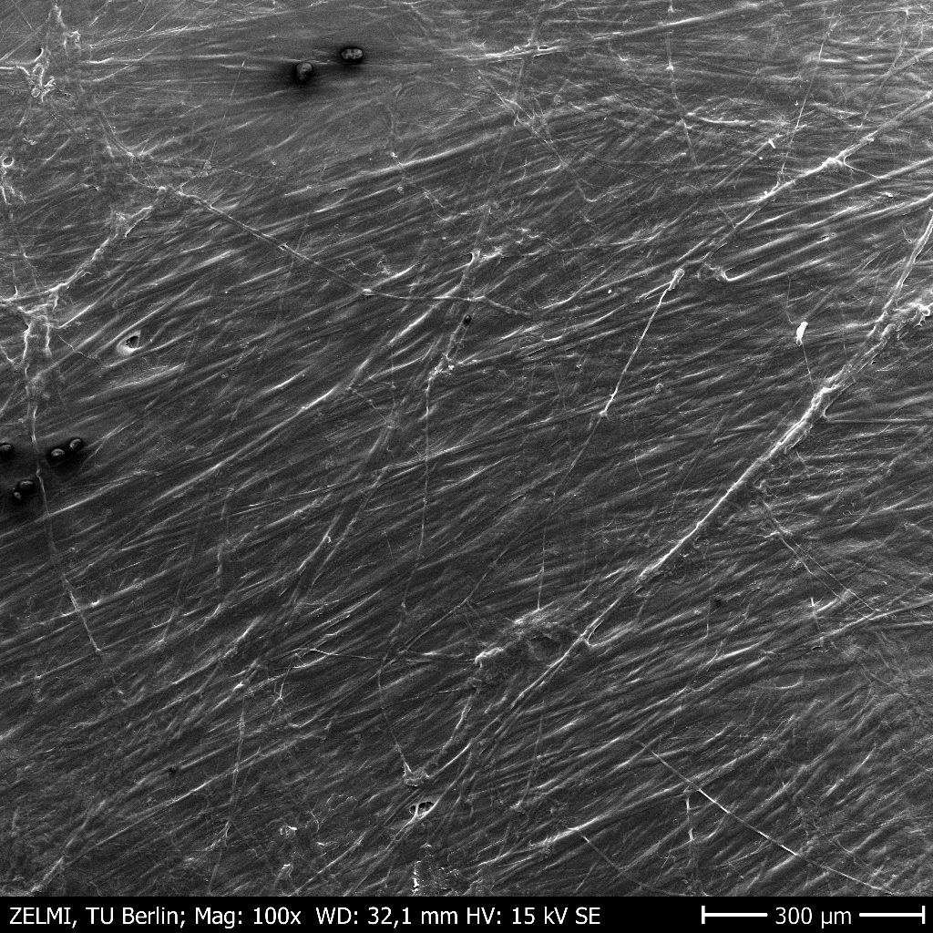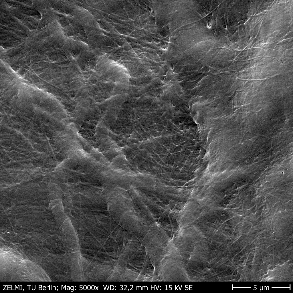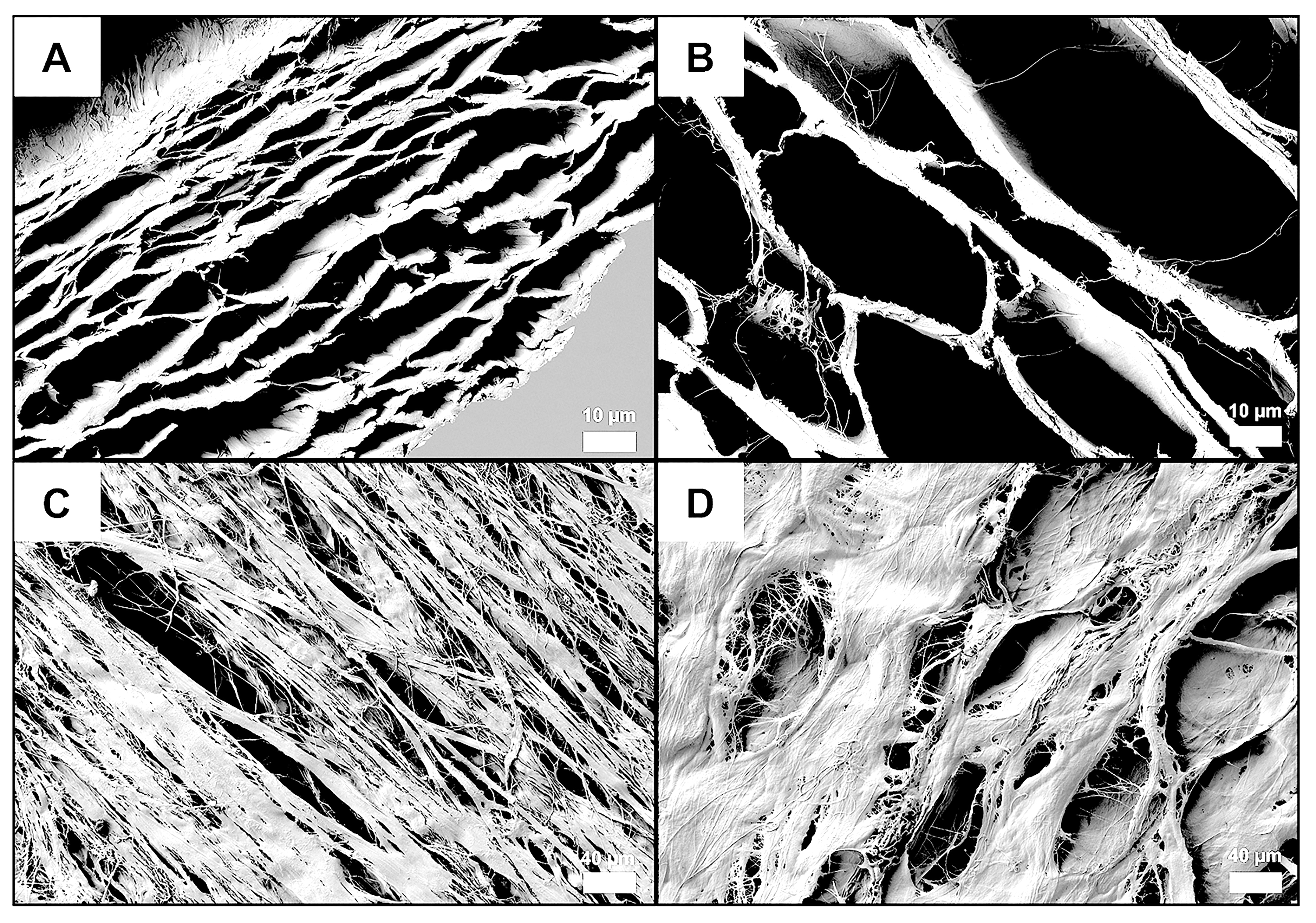 The compact membrane structure, composed of native collagen fibers derived from pericardial tissue, shows a homogeneous fibrillar organization in SEM images. This regular micro-architecture forms the basis of the biological performance that supports tissue integration and neodura formation.